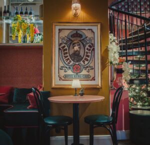 La Belle Epoque – en historisk fredsperiod i Frankrikes historia – beskrivs som en “vacker och ljuvlig tid”. Färgfesten i de 6 meter höga lokalerna speglar just detta. Här finns allt från rosa marmor och senapsgula fondväggar till snirkliga blomstermönster signerade William Morris.